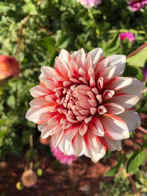 Photo by CDS member Heather Barron. Heather says, "Reminiscent of a bowl of orange sherbet and vanilla ice cream. Every bloom has different ratios of pale orange and white." Beautiful orange and white bicolor. Let's pair this dahlia with that summer ice cream.