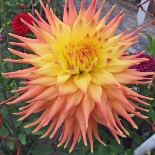 A stunning dahlia with a light blend of orange and yellow colors. Perfect for planting in your garden.