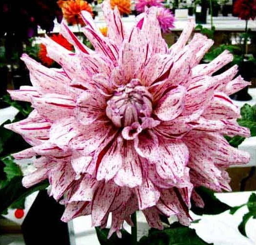 Flowers are large, shaggy and streaked with white, cream, pink, magenta, and violet. Plants are vigorous with long sturdy stems.