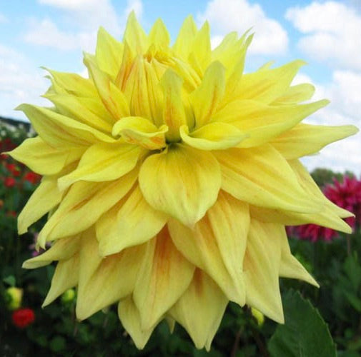 Massive blooms up to 12" wide. Undoubtedly a sight to behold, commanding attention with its sheer size and beauty. Such an eye-catching sight in summertime. Only one plant is required to get your attention! Light blend of yellow and pink. It's truly a showstopper that epitomizes the splendor of summertime in full bloom.