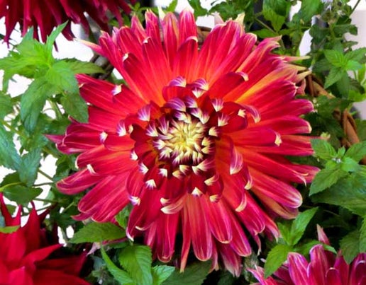 Dinner-plate blooms in shades of red-raspberry tipped with white.