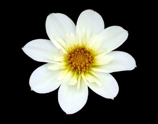A snow white collarette-type dahlia with cheery yellow centers and an inner "collar" of smaller florets. This vigorous and upright bushy plant grows 3-4' tall with 4-5" blooms. Prolific blooms and strong stems.
