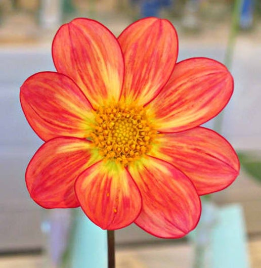 Bronze front with red trim around the petal and a red back. Won best single dahlia at the 2014 ADS national show. About 3” blooms are a soft yellow with rose edging on the petals. These petite blooms hold extremely well when cut, and blend with most colors.