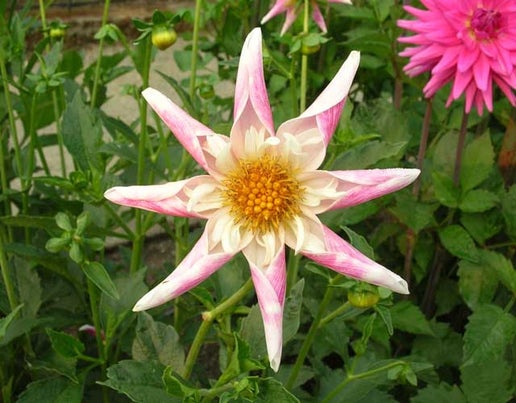 This is a fairly new dahlia, introduced in 2018, from Ron Miner, American Dahlia Society trustee. A pleasing color blend. It’s white and dark pink, and grows 4.5' tall.