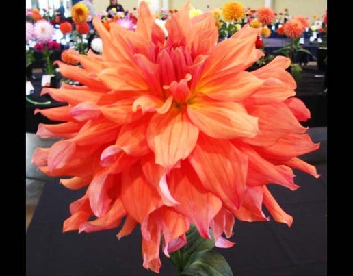 A magnificent giant dahlia that is a blend of warm, sunset hues that run from apricot and coral to raspberry and rose pink. Loosely rolled and twisting petals.
