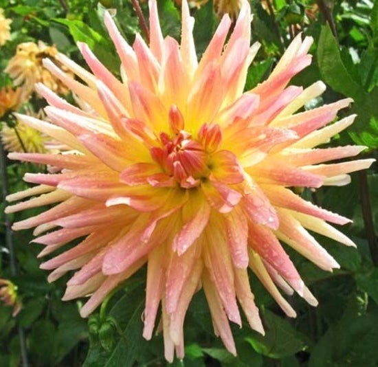 The Cabana Banana dahlia is sure to bring a smile to your face with its charming name and delightful blooms. Its 7” subtle and beautiful flowers feature soft yellow petals with a pink blush on the tips, reminiscent of rosy cheeks after a day in the sun. When cut for arrangements, the radiant rolled petals showcase varying displays of blush pink streaks, adding a touch of whimsy and warmth.