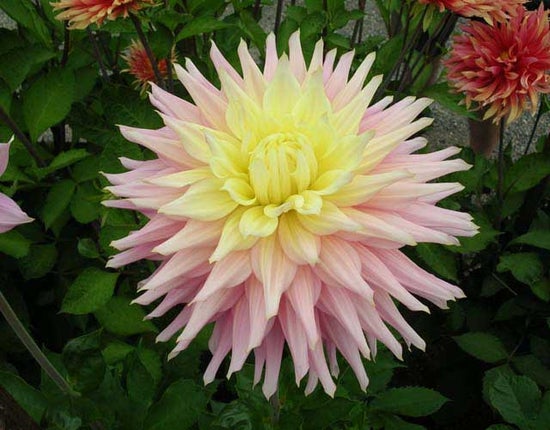 This dahlia is a true showstopper, boasting 10” beautiful pink and soft yellow blooms on a 4' plant. This vibrant and eye-catching flower features large, beautifully formed blooms with petals displaying a center of bright yellow surrounded by soft pink. It's a spectacular, massive semi-cactus dahlia that is sure to turn heads in the garden and arrangements alike.