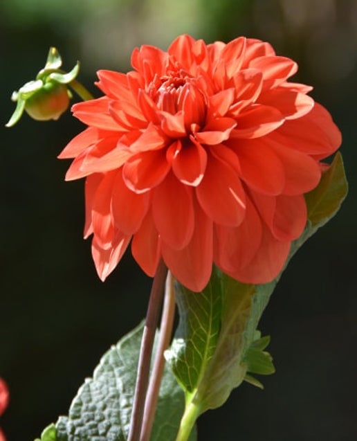 Deep, flaming orange, 4-inch, formal, decorative blooms appear in August and September on this shorter statured (to 3 feet) plant. Blooms have good stems for cutting. Floral designers choice for fall bouquets. Also looks pretty with dark purple for a pop of color!