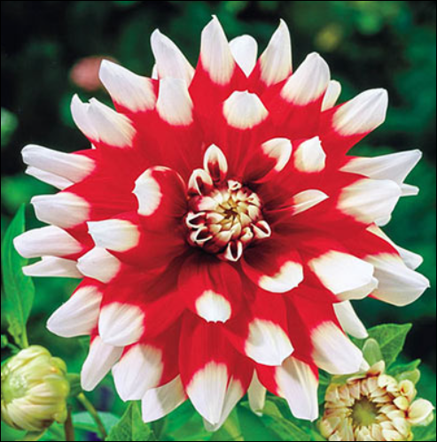 ‘Duet’ is a fabulous bicolor variety with deep red petals toward the heart of the bloom against crisp white at the tips. These are large, double flowers that are up to 5-6 inches wide.