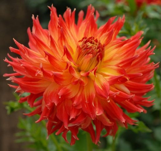 Yes, we are fired up for this dahlia! Fired Up lives up to its name. It's a blaze of color with orangey-red petals that are like flames and and burning hot yellow at the center. Blooms are spiked. Don't get too close.