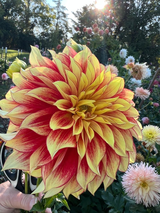 Photo by CDS member Kathleen Carroll. "A very head-turning display of 8" flowers." Call the fire department! Vivid blooms of orange and yellow, the petals twist and curl slightly making them look like flames. Fabulous fiery breathtaking blooms.