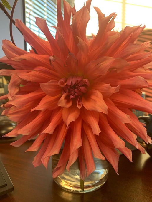 According to Swan Island Dahlias, this dahlia variety was "named in celebration for a local morning show’s 20th anniversary. The 5” orange blossoms have a slight curl that show off the hot pink reverse. This 5 ½’ plant will stand strong and upright in your yard or garden. Excellent cut flower. Enjoy and always have a “good day!"