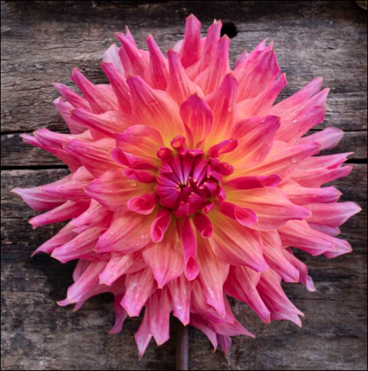 Just Peachy is medium sized semi-cactus variety with peachy orange coloring, with hints of fuchsia on the tips of the petals, a pink center, and petals that actually sparkle in sunlight.