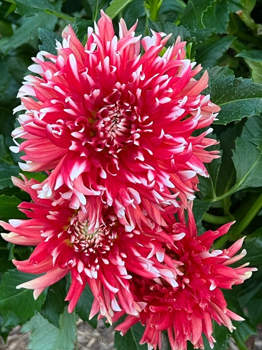 Photo by CDS member Kathleen Carroll. "Upright bushy plants with red B-sized blooms with white tips." This is a stunning variety with a striking appearance and abundant blooms. The deeply divided or fringed (laciniated) petals create a dazzling effect of brilliant red with sparkling white tips. Produces buckets of 6"+ blooms.