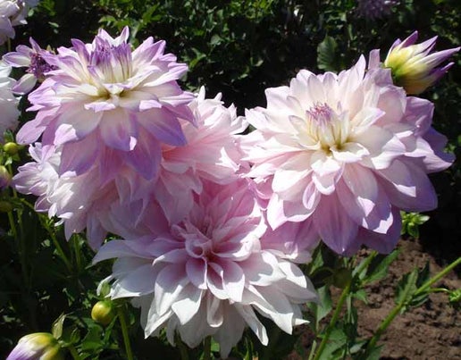 A decorative (informal type) dahlia with elegant cotton-candy-like blossoms in soft white with lilac tips. Grows 3-4' tall with 6-8” blooms. Simply lovely white and lavender-pink Victorian looking blooms.