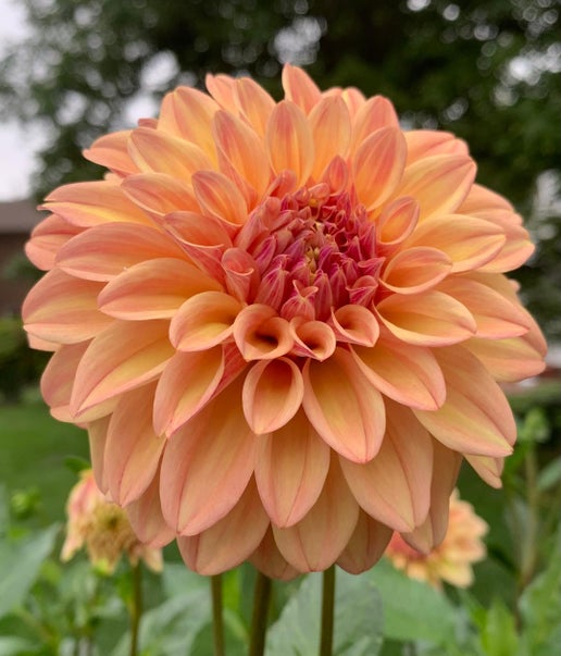 Photo by CDS member Heather Barron. Heather says, "I love this dahlia. I say that about almost every dahlia I grow, but Miss Amara is special. Her color varies with the temperature. It ranges from a pale peach with yellow to a deeper peach streaked with pink highlights, but she is always breathtaking. She blooms bountifully all season, her stems are long, and almost every bloom is perfection personified."