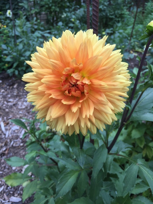 Grown & Photographed by CDS member, Nan Matteson. This dahlia is sure to be show-stopper! The vibrant orange color of the Mrs. Eileen dahlia is almost tangerine in color, lighting up your garden against the lush, green foliage.