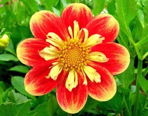 Rare flame-colored collarette form dahlia. Vibrant color and heavy bloomer.