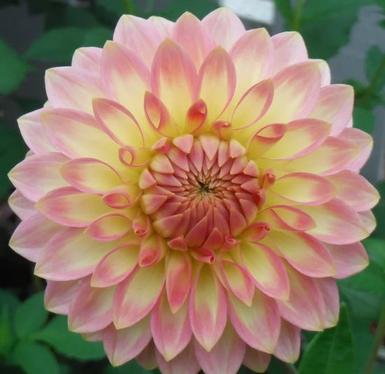 What a charming miniature dahlia! Soft, pastel colors of yellow and pink. It's a delicate flower with petals reminiscent of softly painted watercolors. This flower evokes a sense of tranquility and serenity.