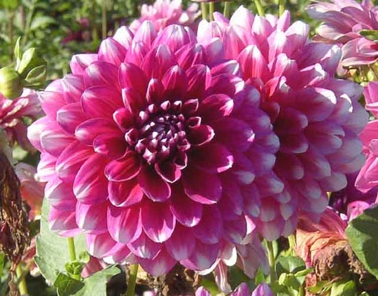 The description paints a vivid picture of a truly captivating dahlia! With its impressive 8" size, the fuchsia bloom stands out with its vibrant pink petals, often adorned with a delicate white edge that adds a touch of elegance. What's particularly intriguing is the variability in the white tipping, ranging from random tips to even markings across the fuchsia-purple petals.