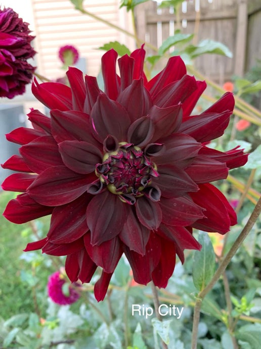 Grown & Photographed by GCDA member, Heather Barron. Heather says, "My personal favorite of the dark burgundy reds. Her blooms are seven to eight inches, and she blooms with enthusiasm. She embodies the artless grace of the perfect informal decorative dahlia."