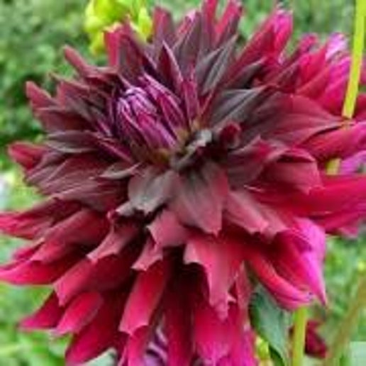 A semi-cactus type dahlia with chic, dark-toned double blooms with pointed ray petals. Grows 5-6' tall with 6-8” blossoms in rusty-burgundy tones. Starts out as a very dark burgundy purple, almost black, then turns more of a dark-reddish purple when it's fully open.