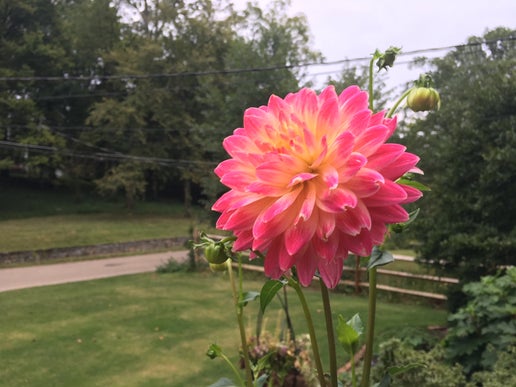 Grown & Photographed by CDS member, Tom Purdy. "This dahlia was why I joined the organization. I had to stake it twice it grew so tall. About 9 feet. I’m putting in a new dahlia garden in my front yard. There were so many blooms. I know I should have clipped some but didn’t know ANYTHING about dahlias last summer." A primrose yellow center and bright magenta tips give this cactus dahlia a warm glow. Introduced in 1975, Tahiti Sunrise is still one of the most popular dahlias varieties in the US. The 5 to 6" blooms are always a highlight in mixed bouquets.