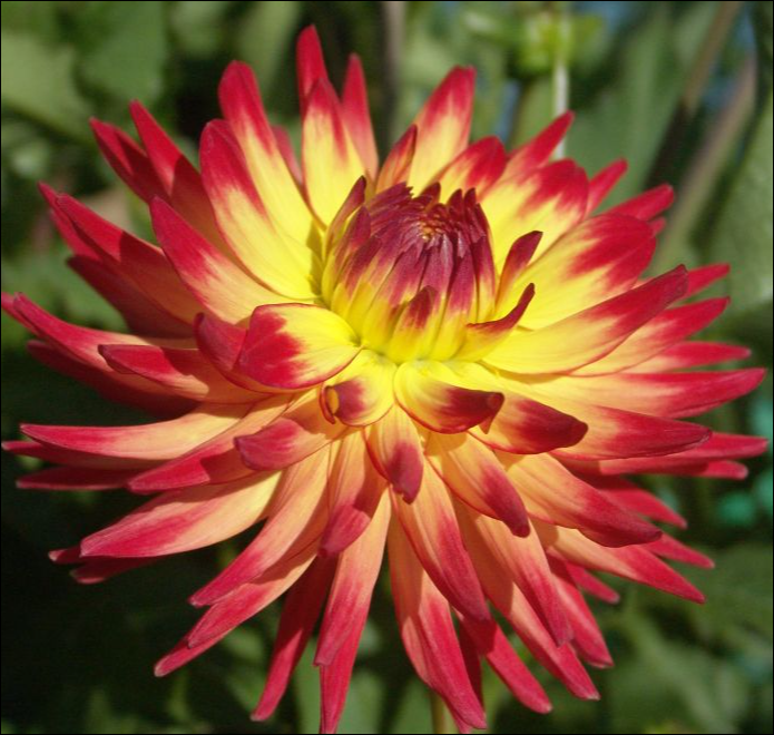 One of the brightest red and yellow combinations we have seen. 3 1/2" blooms are a bright yellow tipped in a magenta red.