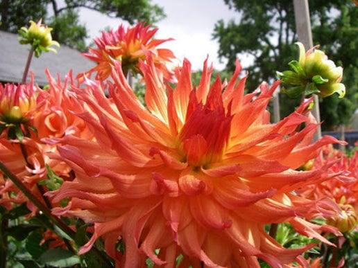 Wild thing, I think I love you! A showy orange dahlia with a touch of yellow. 9 inch blooms on a 4 foot tall plant. Such fun blooms on a really nice vigorous plant. Bold, showy blooms on strong, sturdy stems. Plants produce many blooms. Perfect for autumn bouquets and arrangements!